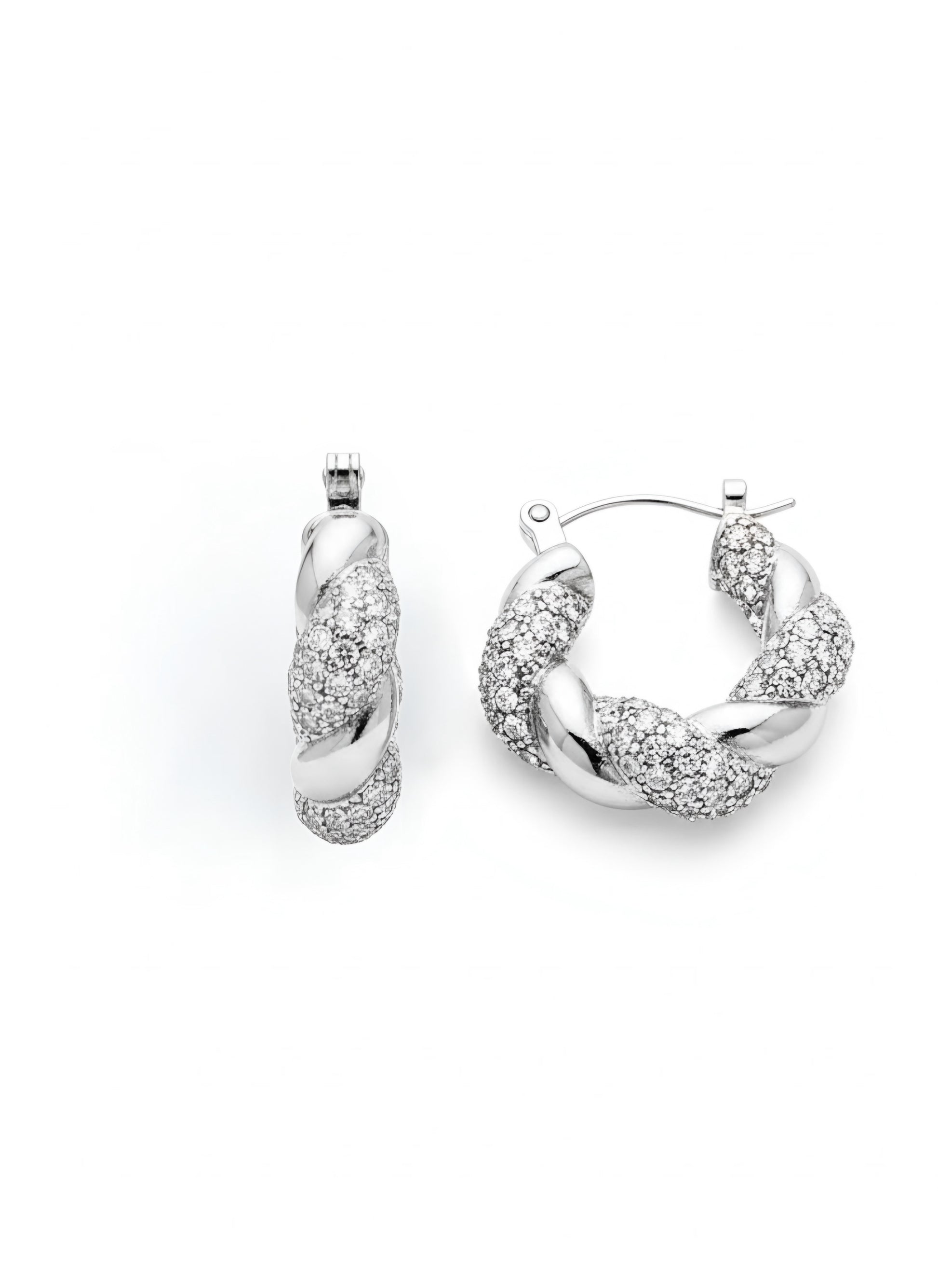 I nostri orecchini a cerchio intrecciato sono caratterizzati da un design twist tempestato di luminosi zirconi incastonati, più precisamente presentano una doppia torsione che alterna la superficie liscia e riflettente a un pavé di cristalli brillanti, ideali per farti brillare come una diva!